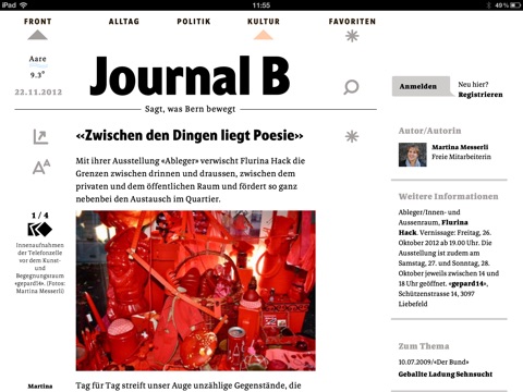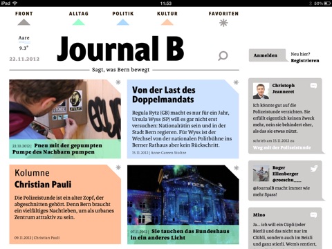Journal B, das erste Online-Magazin der Stadt Bern, gibt es jetzt auch für ihr iPhone und iPad. In drei Ressorts – Politik, Kultur und Alltag – berichtet Journal B über Themen, die Bernerinnen und Berner bewegen. Die Redaktion zeigt die Gesichter und Geschichten hinter den News und den grossen Schlagzeilen. Auf journal-b.ch finden die B-Seiten ihren Platz.