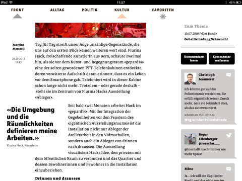Die Leserinnen und Leser beteiligen sich an der publizistischen Entwicklung von Journal B. Sie, beeinflussen mit ihren Vorschlägen, Diskussionen und Ideen aktiv die thematische Ausrichtung des Online-Magazins mittels Kommentarfunktion inklusive der Anbindung an die Social Media-Netzwerke Twitter, Facebook und Disqus. Die App zeigt auf einen Blick, welche Artikel wie oft kommentiert wurden.