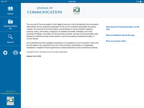 A leading communication journal is now available on your iPad and iPhone. Fresh from the newsstand, “Journal of Communication” brings you a stimulating, high-impact mixture of original research in the field. Enjoy an entirely new browsing and reading experience, and keep up to date with the most important developments in communication research even faster: