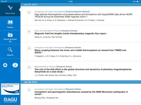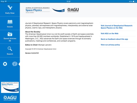 Leading journals from the American Geophysical Union are now available on your iPad iPhone. Fresh from the newsstand, Journal of Geophysical Research: Space Physics covers aeronomy and magnetospheric physics, planetary atmospheres and magnetospheres, interplanetary and external solar physics, cosmic rays, and heliospheric physics. Enjoy an entirely new browsing and reading experience, and keep up to date with the most important developments in the geosciences: • Stay current with the latest recently published articles– updated almost daily.