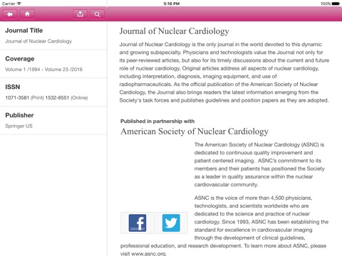 Tap into the most recent developments in nuclear cardiology with the Journal of Nuclear Cardiology app. The Journal of Nuclear Cardiology is a peer-reviewed medical journal published by Springer Science+Business Media. The Journal continuously publishes review articles, original papers and educational articles written by leading members of the medical community.