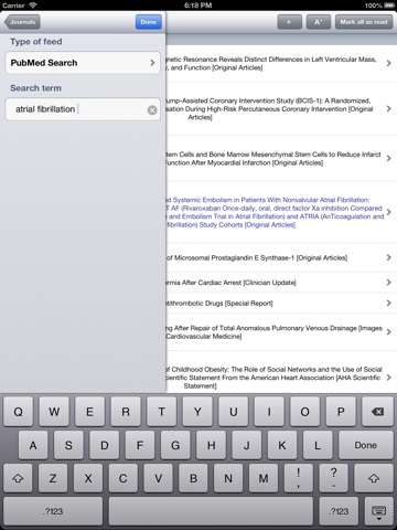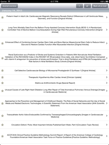 The app allows you to scan relevant journals in cardiology in a fast and efficient way for the newest papers. In addition you can define pubmed searches of your topic of interest and add custom rss-feeds. You can scroll abstracts (or even full text with the weblink) to quickly decide whether that is a relevant paper for you or not. If so, you can mail the link and read/store the paper in your library on your PC or laptop Or you can save it to the myarticles section of the app and read it later on your iphone. You can also share with friends and colleagues by email, facebook or twitter (iOS 5).