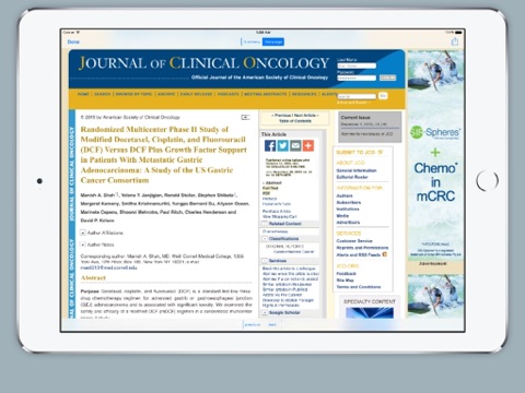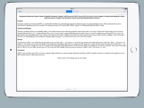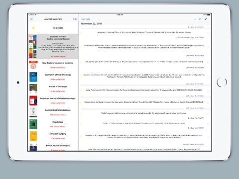 This app was developed by an oncologist for oncologists in order to not miss important new publications. The app presents an extract of all relevant articles regarding gastrointestinal (gi) cancer of the 10 most relevant journals in gastrointestinal oncology. Some of the articles will be commented by gastrointestinal cancer specialists (this feature will gradually be introduced in autumn 2013). You can also suggest important gi cancer articles which will then be included in the extract of all relevant gi cancer articles. In addition you can define pubmed searches of your topic of interest and add custom rss-feeds. You can scroll abstracts (or even full text with the weblink) to quickly decide whether that is a relevant paper for you or not. If so, you can mail the link and read/store the paper in your library on your PC or laptop. Or you can save it to the myarticles section of the app and read it later on your iphone. You can also share with friends and colleagues by email, facebook or twitter (iOS 5). Although the big journals have apps themselves, you tend to loose yourself in all the additional content provided and it is very difficult to scan the 10 most relevant journals for gi cancer articles. Moreover it is often not convenient to read articles on the iphone. Journal Scan Oncology is the answer for fast and efficient scans of important information.