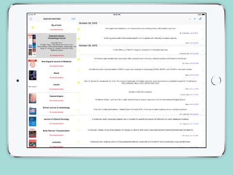 The app presents an extract of all relevant articles regarding hematooncological malignancies of the 10 most relevant journals in this field. In addition you can define pubmed searches of your topic of interest and add custom rss-feeds. You can scroll abstracts (or even full text with the weblink) to quickly decide whether that is a relevant paper for you or not. If so, you can mail the link and read/store the paper in your library on your PC or laptop. Or you can save it to the myarticles section of the app and read it later on your iPhone. You can also share with friends and colleagues by email, Facebook or Twitter.