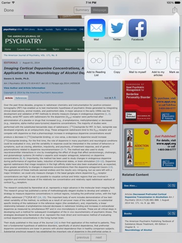 The app allows you to scan relevant journals in psychiatry in a fast and efficient way for the newest papers. In addition you can define pubmed searches of your topic of interest and add custom rss-feeds. You can scroll abstracts (or even full text with the weblink) to quickly decide whether that is a relevant paper for you or not. If so, you can mail the link and read/store the paper in your library on your PC or laptop. Or you can save it to the myarticles section of the app and read it later on your iphone. You can also share with friends and colleagues by email, facebook or twitter (iOS 5).