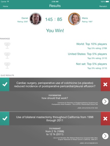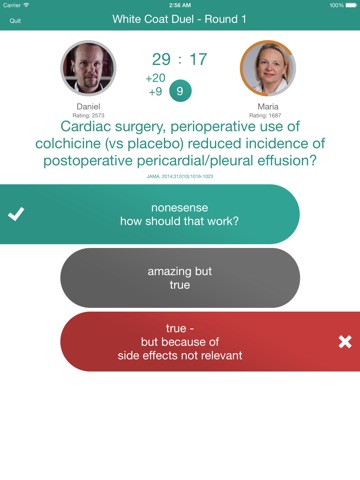 JournalQuiz Internal Medicine is an interactive quiz for medical doctors with an interest in internal medicine to test their knowledge about the newest publications in relevant medical journals (e.g. JAMA, Lancet, BMJ, NEJM, JCO, Annals of Oncology, Lancet Oncology). One can play online with colleagues or invite specialists from around the world to be the opponent in the quiz. JournalQuiz Internal Medicine is an interactive way to learn – wherever and whenever it fits a busy schedule.