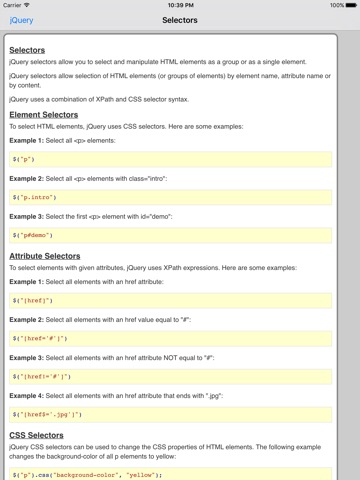 The jQuery properties/functions/methods are categorized and searchable. Each detailed information screen contains a description, parameters, examples, browser compatibility, and more. In addition, most of the examples include the actual output.