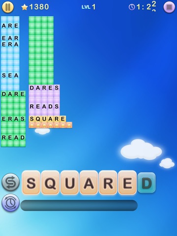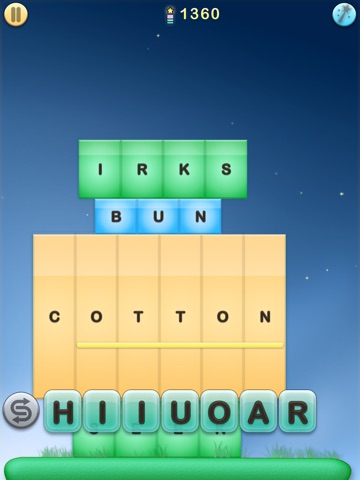 Jumbline 2 includes two additional games: Cloud Pop and Star Tower. In Cloud Pop, your goal is to pop as many clouds as possible, by spelling words out of the letters carried in each cloud. In Star Tower, your task is to build the tallest tower you can, before it sinks into the ground, by making and staking words out of an infinitely jumbled line of letters. The larger the word, the slower your tower sinks, so scramble and twist your brain to think big!