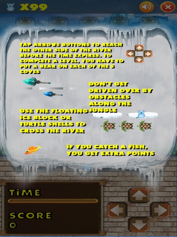 Jumper Polar Bear is a endless arcade corssy road game, tap arrows buttons to reach the other side of the river before the time expires. to complete a level, you have to put a bear on each of the 5 coves. Dont get driven over by obstacles along the jungle, use the floating ice block or turtle shells to cross the river, if you catch a fish, you get extra points.