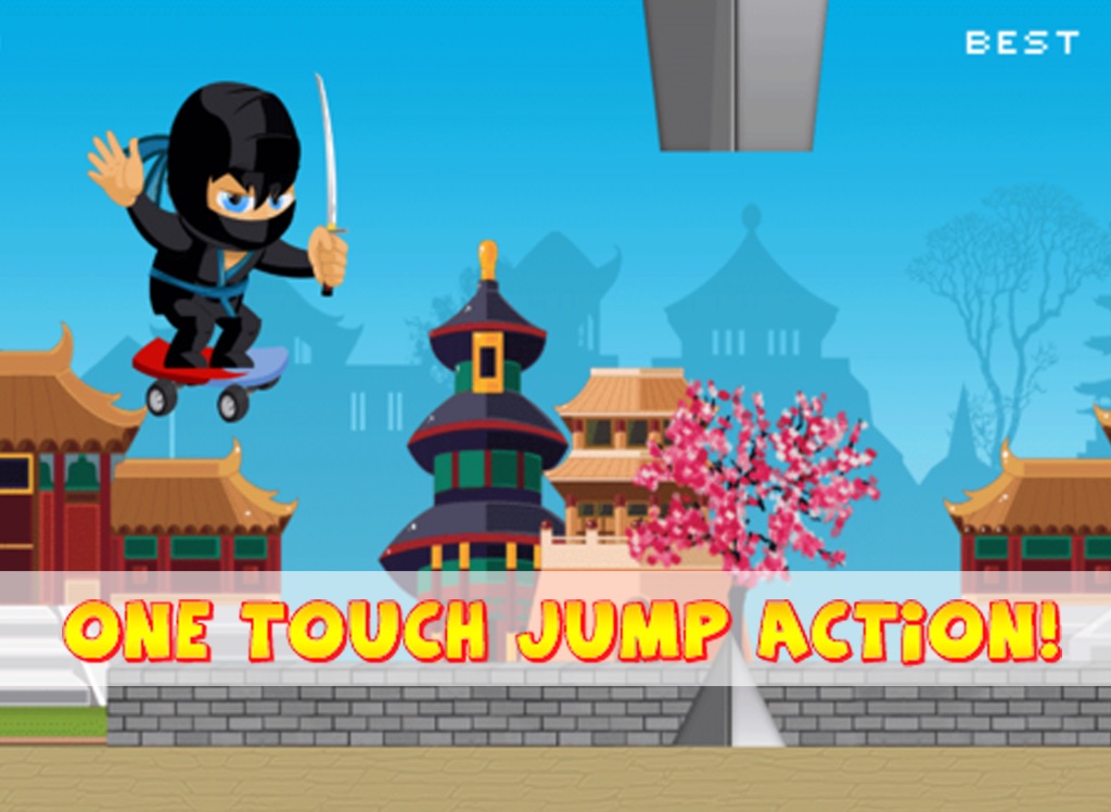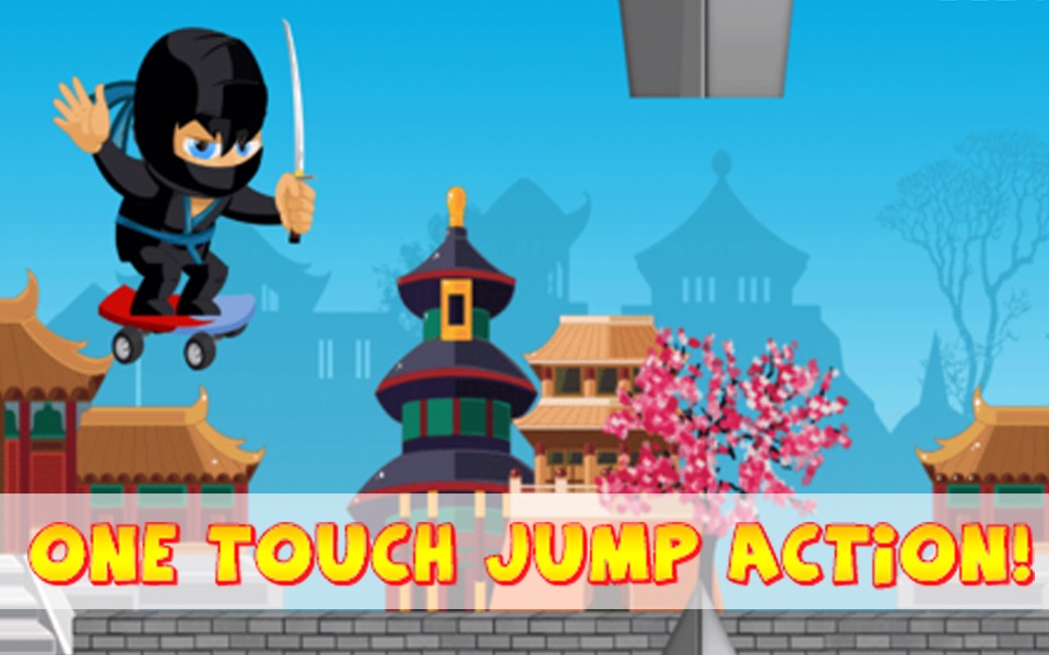 Simple one touch gameplay! Timing is key. Tap on your device to make Skateboard Ninja jump.
