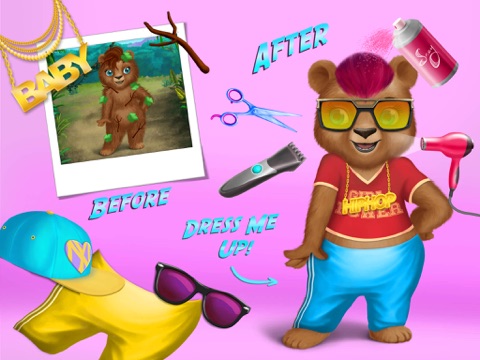 Bear Kim looks cute, but it’s makeover time! Style her for hip hop music concert: first wash, cut and dye Kim’s hair in pink, then design a cool outfit for her!