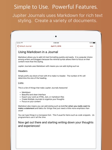 The App uses Markdown to provide rich text and styling options. Robust exporting makes it easy to share your work as a text, markdown, or html file.