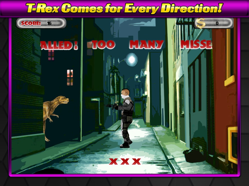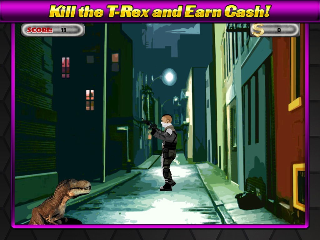T-Rex and other Dinosaurs have taken over the city. Shoot as many Dinosaurs as you can and earn cash to buy bigger guns! Be careful! The dinosaurs come from every direction and at a fast pace.