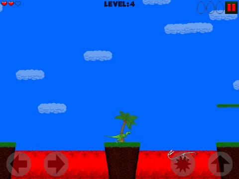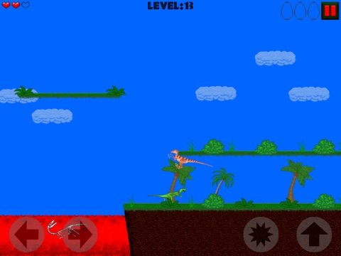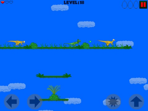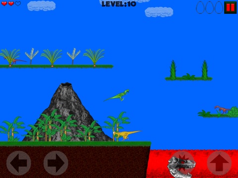 Enter a prehistoric jurassic world filled with dinosaurs and play as a Dilophosaurus in this 2D platformer. Battle Compsognathus, Pachycephalosaurus, Velociraptor, and the mighty Tyrannosaurus Rex. Jump on platforms and avoid lava pits. Collect three dinosaur eggs in each level and advance through the island. Collect hearts from defeated dinosaurs to refill your life. Time jumps to land on moving platforms and avoid attacking dinos. You will be able to jump much higher if you are running. Good luck and beware of the mighty T-Rex.