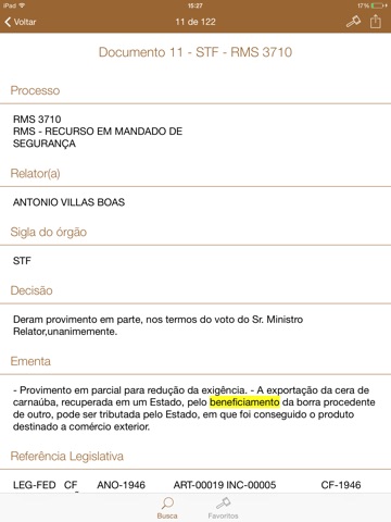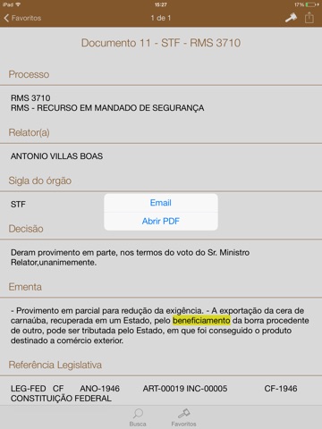 No resultado das buscas são destacadas as palavras-chave encontradas, facilitando a visualização daquelas decisões mais relevantes, as quais pode ser salvas para leitura posterior. Também é possível salvar a jurisprudência selecionada como favorito ou gerar um PDF da mesma, podendo encaminhar por email ou utilizar em outros aplicativos do seu device.