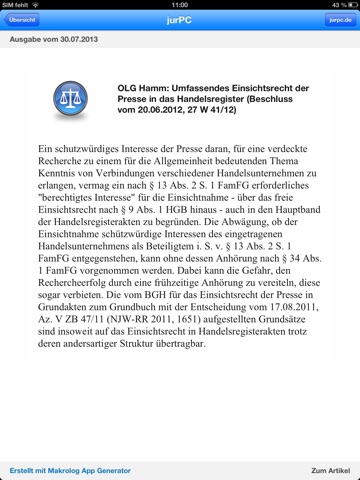 Mit der JurPC-App bleiben Sie immer auf dem laufenden und sind regelmässig über die neuesten Veröffentlichungen informiert. Sie sehen sofort, wenn ein neues Heft online gegangen ist und können sich ganz bequem über die App die neuen Beiträge auf Ihrem mobilen Gerätansehen.