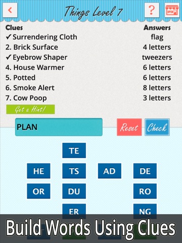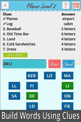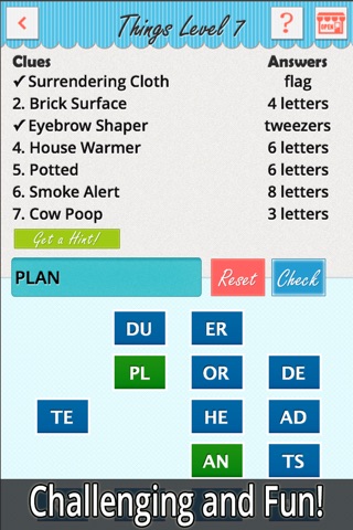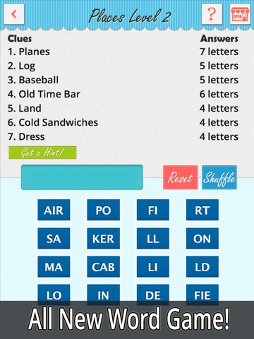 This amazing word game has six different categories to choose from. Each category has 30 mind bending levels. Heres the thing...It starts out easy and continues to get progressively harder. Guess the answers in any order. Check if your answer is correct by tapping the green check button. Tap the "shuffle" button to rearrange the letter boxes. Still stumped? Dont lose any sleep over it! Just Seven Words has a "Get a Hint" button.