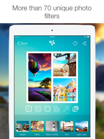 ● Shoot in Multiphoto Mode: all photos are placed in one collage on the same screen