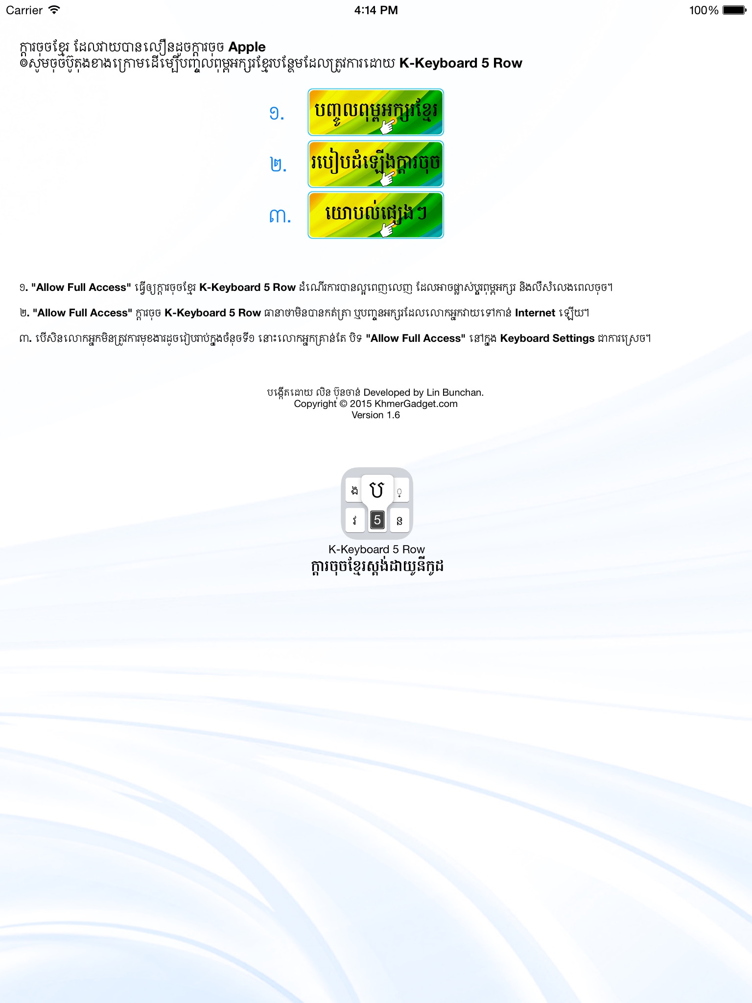 សូមអរគុណដែលបានបង្កើតក្ដារចុចនេះឡើង។។ មានបញ្ហាខ្លះៗជាមួយiOS9 ដូចជាពេលចូលហ្វេសប៊ុក ឬ យូធូប ជួនកាលមិនបង្ហាញក្ដារចុចឲ្យវាយ។។សង្ឃឹមនឹងមានកំណែទំរង់ថ្មីឆាប់ៗ