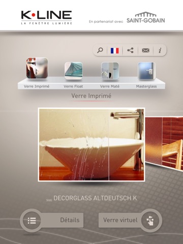 Une nouvelle application gratuite développée par Saint-Gobain et K-LINE pour vous permettre de bien choisir vos verres décoratifs. Cette application vous permet de visualiser en temps réel et de manière particulièrement réaliste l’effet esthétique des verres de décoration translucides. Embarquant un large choix de verres décoratifs de la gamme Saint-Gobain et qui équipe les menuiseries K-LINE, cette application marque un nouveau cap dans l’utilisation des techniques de réalité augmentée au service des clients.