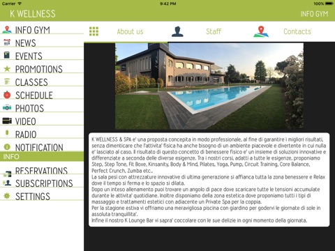 K WELLNESS & SPA e una proposta concepita in modo professionale, al fine di garantire i migliori risultati, senza dimenticare che lattività fisica ha anche bisogno di un ambiente piacevole e divertente in cui nulla e lasciato al caso. Il risultato di questo concetto di benessere fisico e un insieme di soluzioni innovative e differenziate a seconda delle diverse esigenze. Tra i nostri corsi, adatti a tutte le esigenze, proponiamo Step, Step Tone, Fit Boxe, Kinsanity, Body & Mind, Pilates, Yoga, Pump, Circuit Training, Core Balance, Perfect Crunch, Zumba etc..