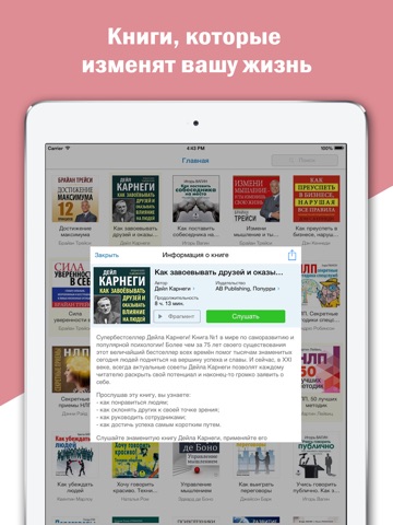 На самом деле я не любитель таких книг вообще в принципе книг, не люблю читать, но эта книга вызвала у меня просто восторг, стремление к развитию и изучению других людей, поднятие самооценки. Эффективность этой книги на 100 % увеличит ваши знания, попробуйте и сами узнаете, я рекомендую! очень интересный дизайн, простой удобный поиск большое количество аудиокниг!