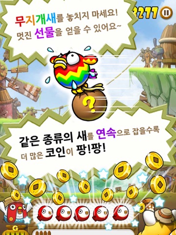 5마리씩 묶음으로 잡았을 때 같은 종류의 새들로 채워져 있을 수록 많은 보상을 얻습니다.