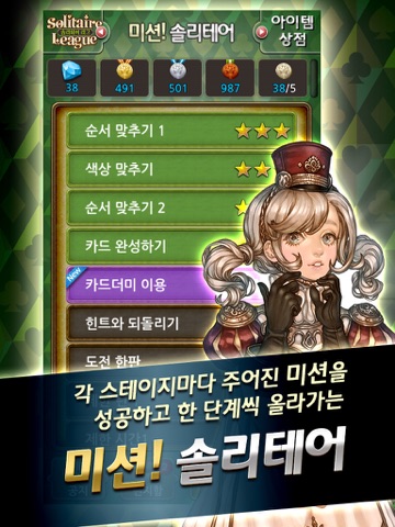 - 주어진 미션을 성공하고 한 단계씩 올라가는 ▶미션! 솔리테어◀