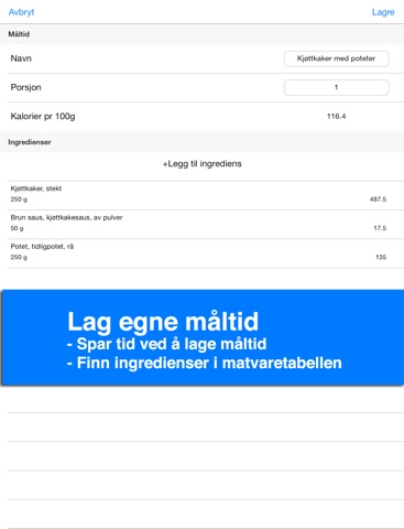 • Du kan legge inn egne matvarer eller sette sammen måltid du ofte spiser for å gjøre kaloritellingen lettere.
