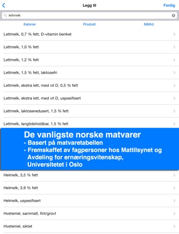 • Du kan søke opp norske matvarer fra matvaretabellen [1]. Tabellen er utarbeidet av mattilsynet, så du kan stole på næringsinnholdet.