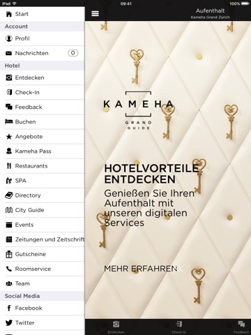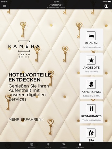 Laden Sie sich die Kameha Grand Zürich Hotel App herunter und nutzen Sie vor, während und nach Ihrem Aufenthalt viele Vorteile. Mit der Kameha App haben Sie die Möglichkeit vor Ihrer Anreise einzuchecken, das Hotel, die Restaurants und den Spa näher kennenzulernen und mit dem Kameha Pass in verschiedenen Bereichen des Hotels bis zu 10% Vergünstigungen zu geniessen.