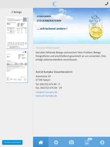 Mithilfe dieser App können Belege, Dokumente und andere Schriftstücke schnell, sicher und komfortabel an das Steuerbüro Kampka gesendet werden. Machen Sie einfach ein oder mehrere Fotos von den Belegen und versenden Sie diese mit einem Klick direkt aus der App heraus an das Steuerbüro Kampka.