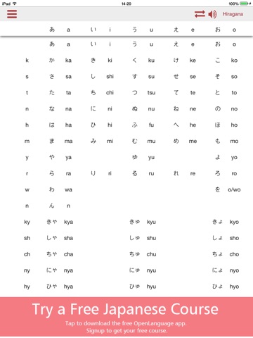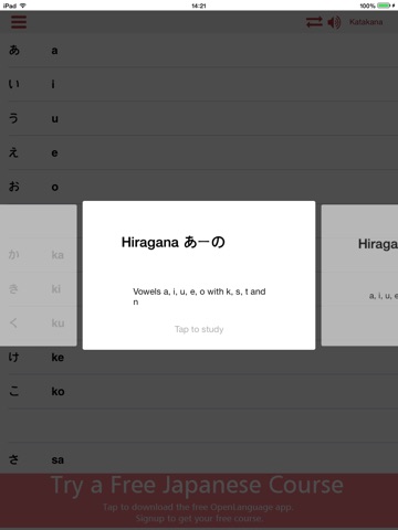 A free full-featured app to learn how to read and write the two Japanese writing systems - Hiragana and Katakana. Features interact hiragana and katakana charts with both male and female pronunciation recordings to help make sure youre speaking correctly. Also includes a tutorial on the writing system and how it is used, taking you through all the characters to help you progress to the point of full reading fluency. Brought to you for free by OpenLanguage Japanese, the online and app-based Japanese language lesson resource.