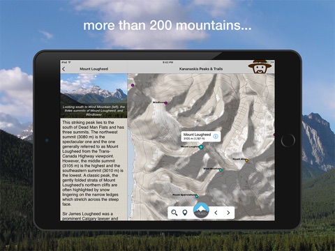 --For each of the over 200 mountains in Kananaskis Country, the app provides photos, its naming history, and other information related to its geology, geographical context, historical significance, and stories of what has happened on the mountain -in many cases connecting interesting historical figures with the individual peaks.