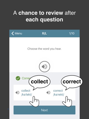 Learn to hear the difference between similar sounds, such as R/L and V/B, using recordings by native speakers. New in Version 3.1 - New question type: same or different?