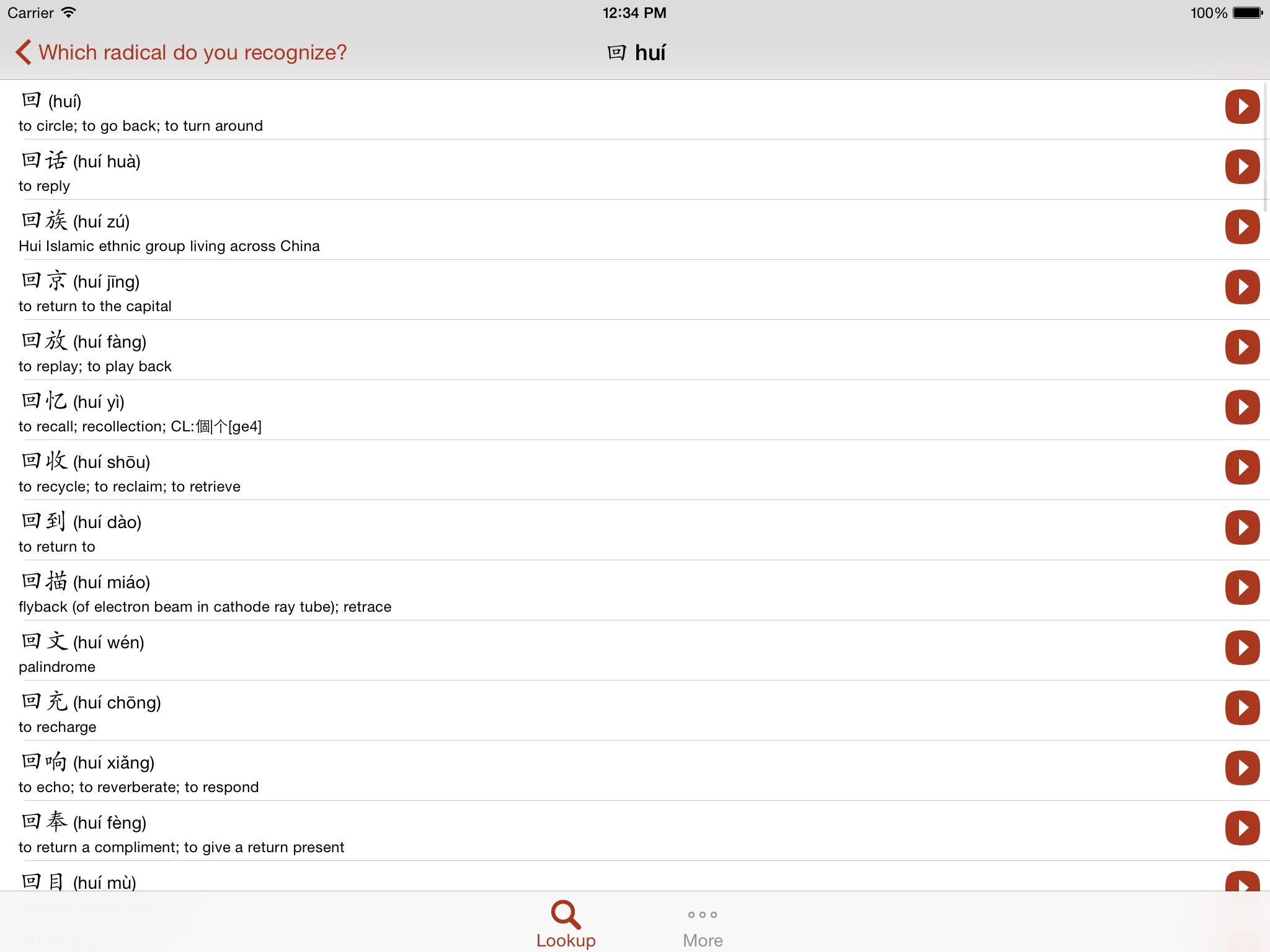 For each character the app contains up to 100 words and phrases together with English translation and Chinese pronunciation.