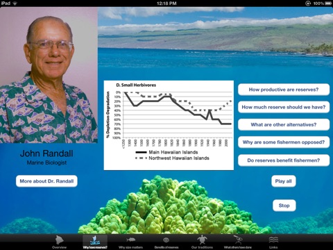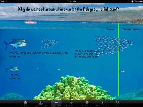 A colorful app that locates the marine reserves of Hawaii, and shows with animation how marine reserves help build fish populations.