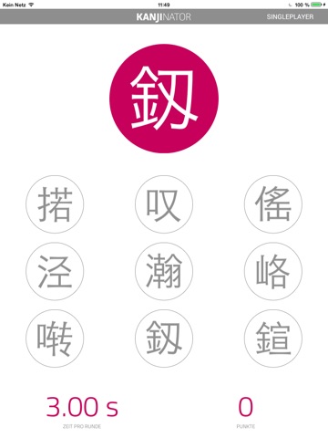 Single Player Mode: Locate the kanji within 3 seconds and click the correct of 9 buttons. You scored your first point. Each round the time gets shorter. For each correct kanji you get another point. The game is over when you click the wrong kanji or do not click anything within the allowed time. A good score will put you in the hall of fame of the greatest Kanjinators in the world.