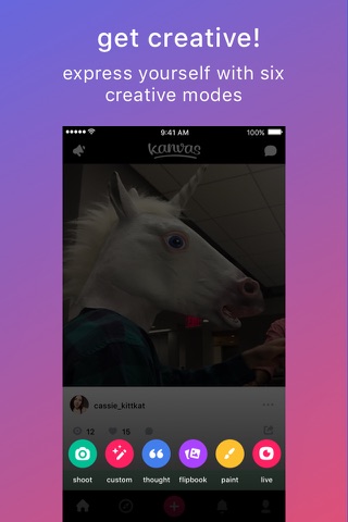 Easily put your creativity into action with our 6 compose modes by making recording gifs, time-lapse & slow motion videos, animations, drawings and photo slideshows. All kanvases are easily shared to Instagram, Tumblr, Twitter, Facebook, YouTube, Messenger, SMS and email!