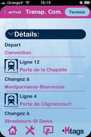 En mode piéton, Kapten for iPhone vous permet de prendre les transports en commun et vous guide jusqu’à votre destination finale. La partie transports en commun est couverte par un carnet de route détaillé. Cette fonctionnalité est disponible pour la plupart des villes ayant un réseau de métro, tramway, RER**. Un mode station à station autonome est également disponible.