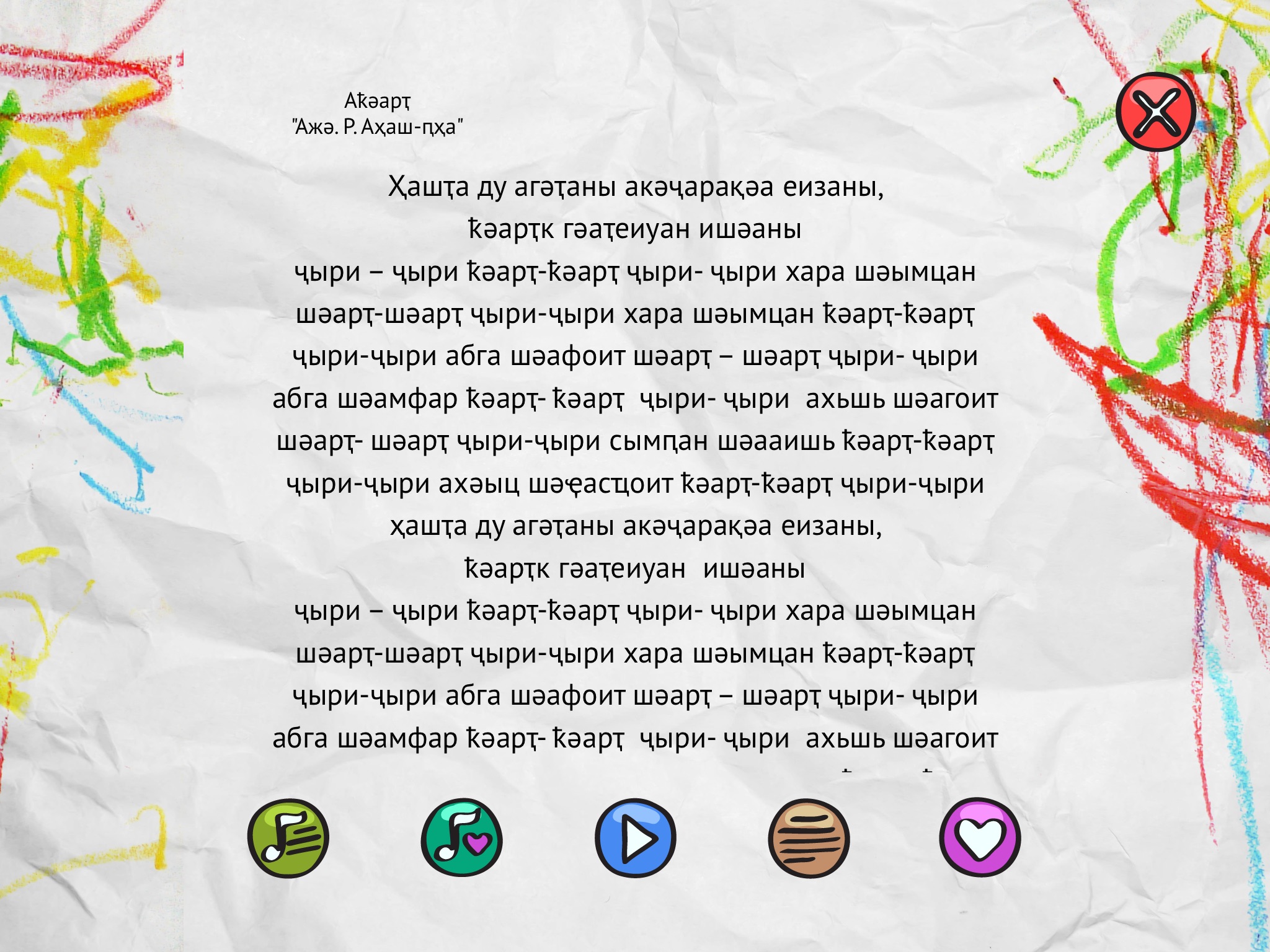 Караоке на абхазском языке для детей. В этот сборник вошли популярные детские абхазские песни. Вы можете наслаждаться музыкой с Вашими детьми в дороге или дома, а так же создавать плейлисты из любимых песен. Окунитесь в детство, подарите себе море радости. С нашим приложением ребенок творчески совершенствуется, тренирует память, развивает слух и голос. Приложение позволяет записать караоке-выступление и сохранить в медиатеке.