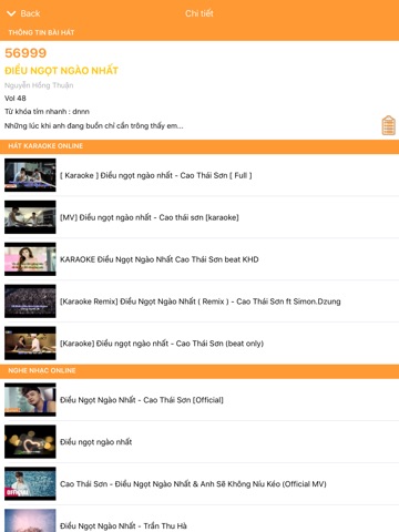 Ngoài tính năng tìm kiếm bài hát theo tiêu đề, bạn có thể tìm theo mã bài hát và tên tác giả. Ứng dụng còn cho phép lưu lại bài hát vào danh sách yêu thích.