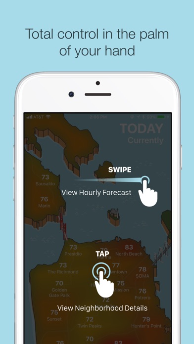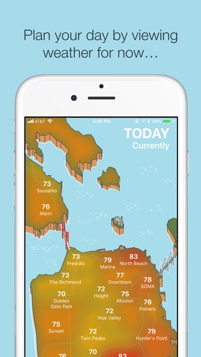 Visualize the weather in San Francisco’s many microclimates or zoom out to plan your day around the Bay Area. View the current temperatures on a beautiful heatmap and swipe across the screen to view forecasted temperatures for the next 24 hours. Want more info? Tap any neighborhood to view detailed weather information.