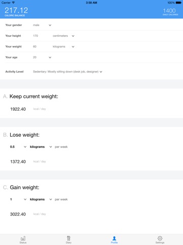 Gosto da interface simples, espero que com o tempo coloquem mais opções, como personalizar a proporção ideal de macronutrientes.