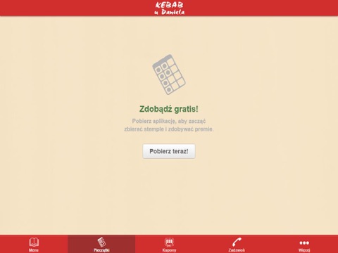 Pieczątki, Kupony promocyjne, Nasze menu, Zadzwoń i zamów, Gdzie jesteśmy, Facebook