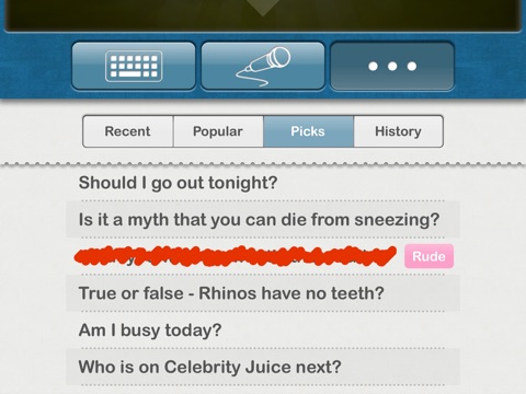 You can interact through speech recognition, keyboard and an array of suggestions including the app communitys latest questions and most popular queries.
