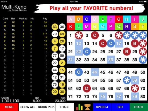 • Play up to 20 keno cards at a time