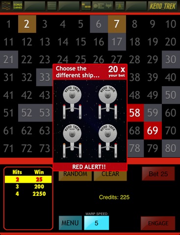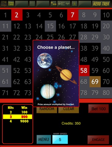 You can win up to 50 free games with a multiplier, get up to 20 extra "balls," pick a planet to get a prize, and race to tap the different Keno Trek Ship to receive the maximum bonus.