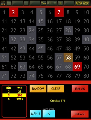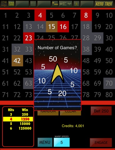 Choose your favorite numbers, then your bet, and press "Engage." You can play at speeds between Warp 1 through 5.