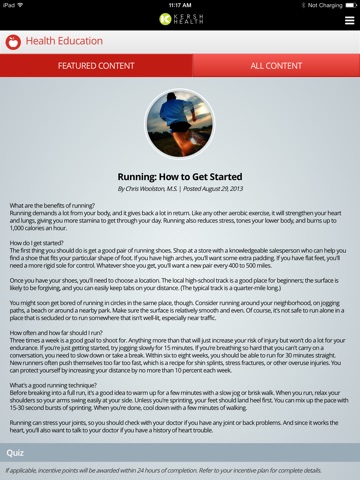 Education: Access Kersh Health’s entire library of articles, videos, and newsletters. If you’ve taken the Qscore, the articles and videos will be tailored to your specific areas of improvement. Now you can earn incentive credit for health education on the go (if applicable).